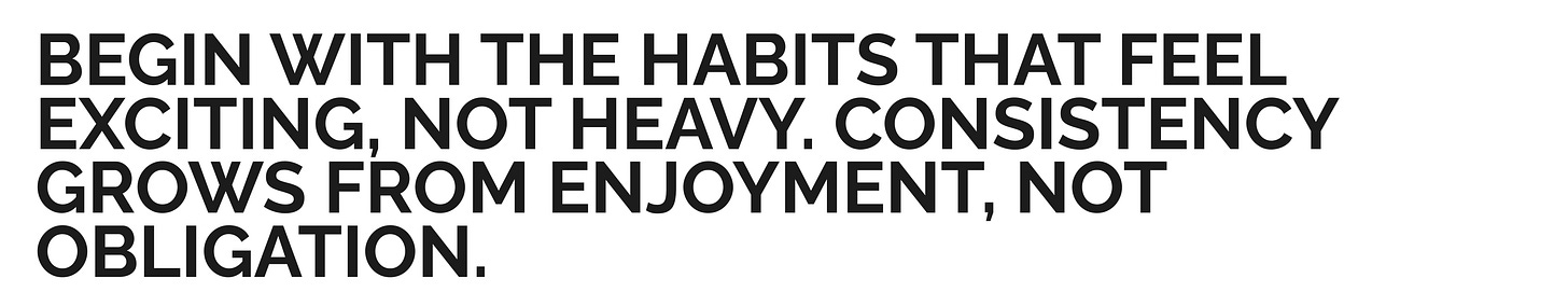 Pick habits that feel grounding, not performative. This could look like morning light + protein, or two strength sessions + one long weekly walk (small anchors that make the rest of the day easier). You’re not choosing actions to prove discipline; you’re choosing inputs that create stability. When habits feel good, they stick. When they feel punishing, they don’t. Start where your body says yes.